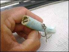 O pedaço de isca artificial que sobrou, com um dos anzóis tortos. |